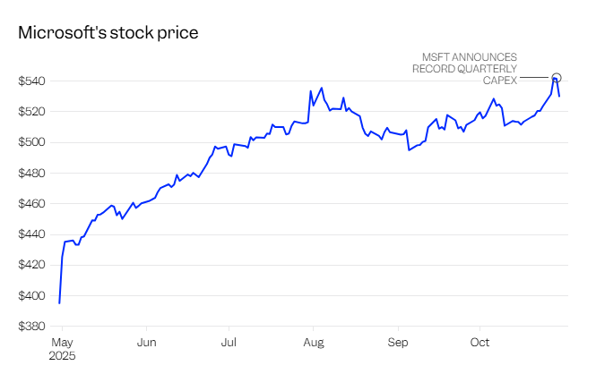 Microsoft had a similar moment when it reported earnings on Wednesday. The software giant said it spent a record $34.9 billion on capex in the past quarter, up from the $24.2 billion the prior quarter, and said spending could increase in 2026.